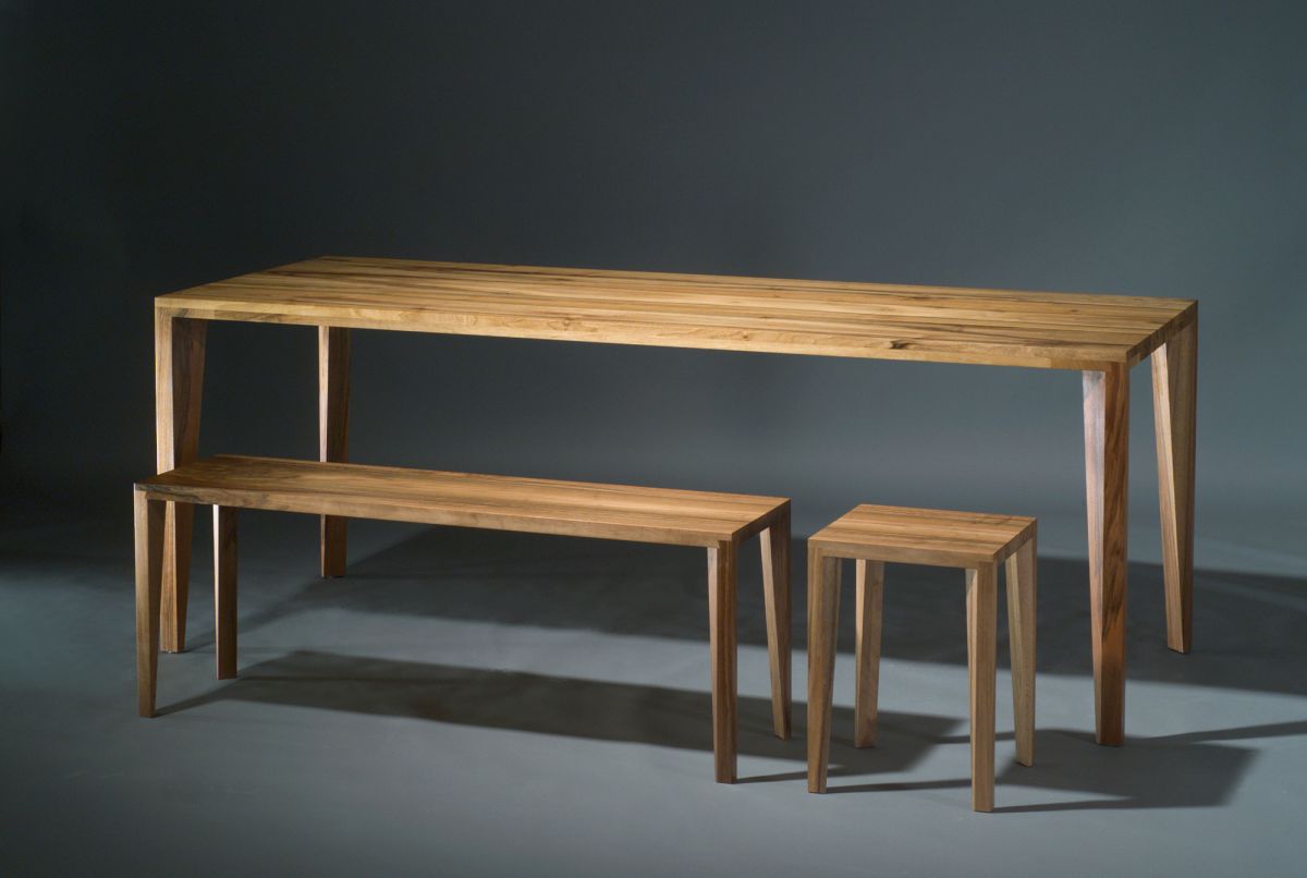 Die Füsse werden wie bei dem Hocker und der Bank im 45° Winkel von Aussen eingegratet. Das Tischblatt ist im äusseren Bereich aufgedoppelt, um Holzverbrauch und Gewicht zu reduzieren. An der Tischunterseite dient ein französischer Keilverschluss (Längsverbindung) als Zugverbindung. Dieser verhindert das Durchbiegen der Tischplatte.