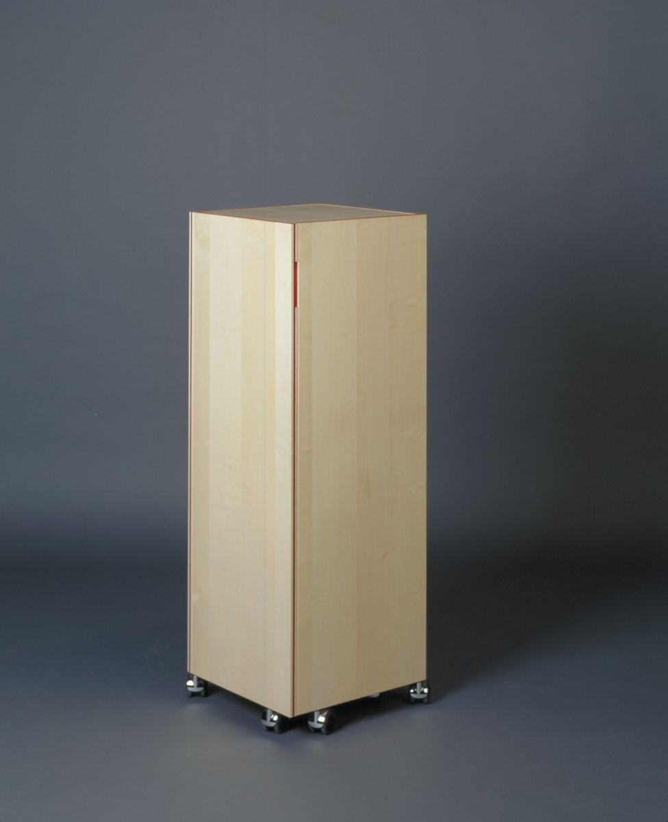 Massiv verleimte Ahornbretter bilden im geschlossenen Zustand den quadratischen Korpus. Eine rote Kantenverzierung weist dezent auf das Innere. Die gezinkten Fächer sind ebenfalls aus massivem Ahorn gefertigt und fest an den Seiten fixiert.